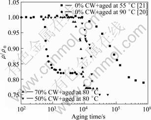 Fig. 7 Evolution of relative resistivity versus isothermal annealing time of cold rolled Pb-0.08Ca-2Sn samples (Results in Refs. [20] and [21] are given for comparison)