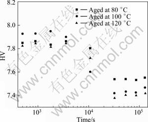 Fig. 8 Evolution of Vickers hardness versus isothermal annealing time of Pb-0.08Ca-2Sn samples cold rolled to thickness reduction of 70%