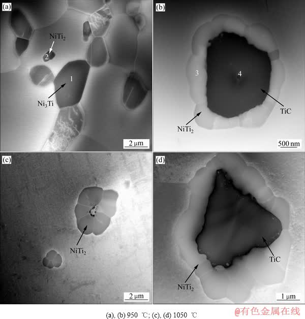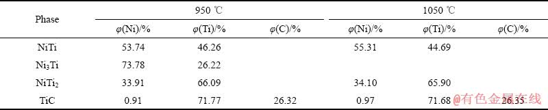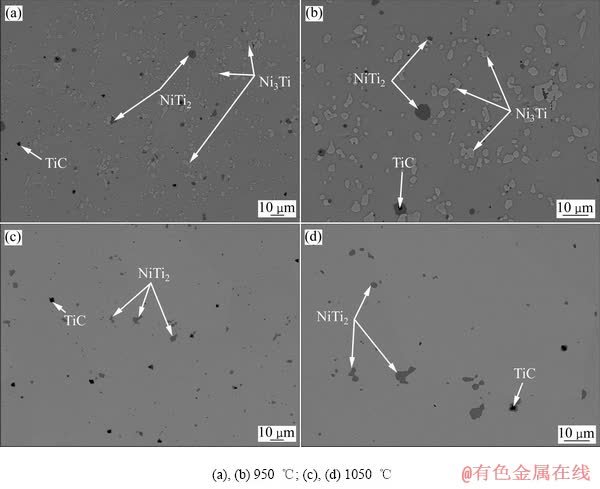 2) 经1050 ℃固溶处理后,相比950℃固溶,合金中的Ni3Ti相接近完全回溶,仍存在大量尺寸在1~10 μm相互伴生的NiTi2及TiC相。