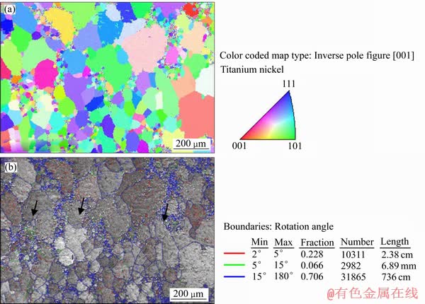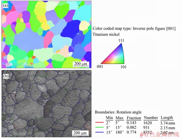 Fig. 3 EBSD IPF maps(a) and IQ maps(b) of NiTi40 alloy after solid solution at 950 ℃ followed by water quenching