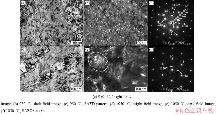 4) 经950 ℃固溶处理,晶内析出相主要为10~20 nm的Ni4Ti3相。经1050 ℃固溶处理,晶内析出相主要为几十至几百纳米的Ni4Ti3相。从SAED谱可以看到存在两种取向的Ni4Ti3相变体。析出相Ni4Ti3和基体NiTi的取向关系为