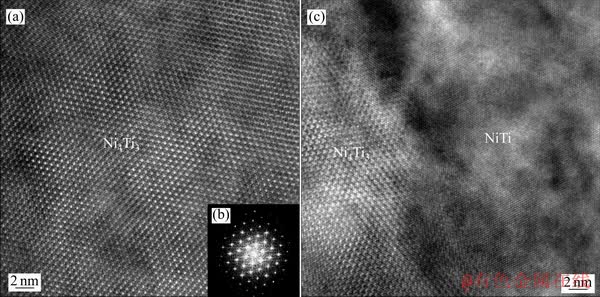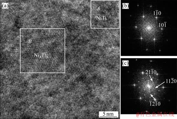 )方向观察的高分辨电子显微像。图6(b)是区域A的快速傅里叶变换(FFT)图,为B2有序结构的NiTi基体。图6(c)是区域B的快速傅里叶变换(FFT)图,为Ni4Ti3析出相。在图6(a)中,从高分辨晶格像难以确定析出相与基体间界面,未见界面处明显的应力衬度。