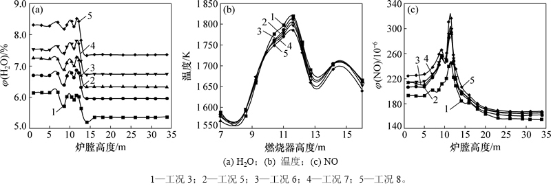 Fig. 8 Temperature and flue gas components distribution along furnace height
