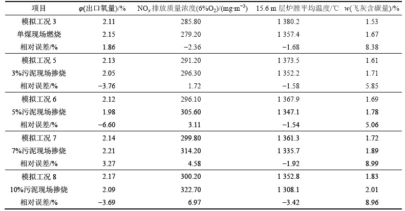 现场试验与数值模拟结果对比见表3。由表3可知:各个工况的NOx排放量与现场掺烧结果相对误差均不超过10%,飞灰含碳量的相对误差不超过10%,并且15.6 m层炉膛温度的相对误差不超过4%,均在合理误差范围内。可见:在掺烧56%含水率的污泥、质量比不超过10%的情况下,炉膛整体温度水平较燃烧单煤工况有所降低,NOx排放下降,飞灰含碳量有所增加,但差别均较小,表明煤泥掺烧对锅炉的正常运行影响较小,实际中掺烧配比较低的污泥是可行的。