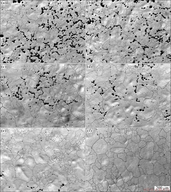 Fig. 1 Optical micrographs of as-cast (a) and solution-treated samples for 6 h (b), 12 h (c), 18 h (d), 24 h (e) and 48 h (f)