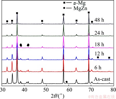 Figure 2 displays the XRD patterns of the as-cast and solution-treated Mg-6Zn alloy samples. Peaks corresponding to α-Mg and β-phase were only detected in the samples that were solution treated for less than 24 h. No peaks representing β-phase were observed in the alloy after solution treatment for more than 24 h.