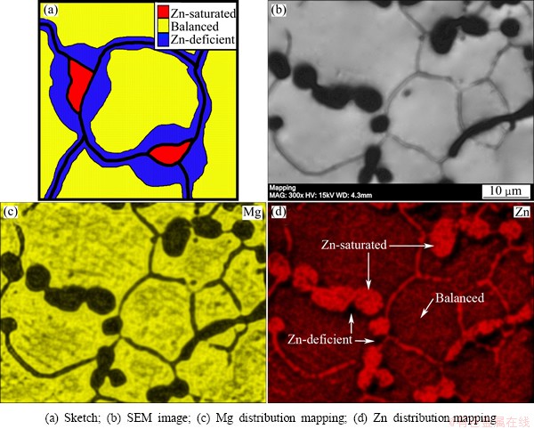 Figure 3 demonstrates the premise that in an as-cast alloy the region located between the β-phase and α-Mg is Zn-deficient. Figure 3(a) illustrates a schematic demonstration of Zn deficiency and saturation in the as-cast samples. Figure 3(b) represents the SEM image of the as-cast sample and Figs. 3(c) and (d) show the Mg and Zn distribution mapping of the sample, respectively. Due to non-equilibrium solidification and nucleation of α-Mg which contains less Zn than the molten metal, some high Zn molten metal solidifies as β-phase. The authors believe that pre-heating the moulds, which is a casting process requirement, causes a low cooling rate and consequently leads to Zn deficiency. The low cooling rate holds the as-cast samples at temperatures below solvus. The as-cast samples would cool down to temperatures below solvus because of a considerable heat transfer resulted from the high temperature differences. As a result, the Zn content diffuses towards grain boundaries and causes nucleation of further β-phase precipitates. Remarkably, when using slow heating to reach solution treatment temperatures, at the temperatures between solidus and solvus, more Zn precipitates towards grain boundaries due to heating below solvus temperature. The α-Mg at the centre of the grains could be affected by the slow heating but remains consistent because the migration of Zn content from the middle of the grains to the boundary requires a longer heat treating at aging temperatures. Consequently, the region between the centre of the grains and β-phase appreciates, the Zn deficient region, has less Zn comparatively. In short, casting and even solution treatment processes could cause undesirable β-phase precipitates, which could negatively affect the Mg-6Zn properties.