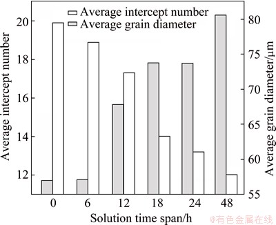Fig. 4 Average intercept number and grain diameter for as-cast and solution-treated samples