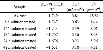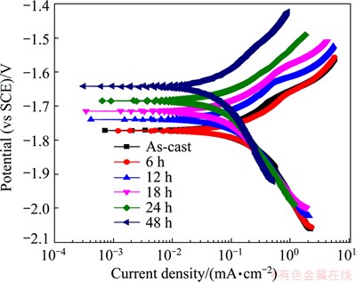 Figure 5 exhibits the potentiodynamic polarization curves of as-cast and solution-treated samples. The presence of current plateaus in the curves of the as-cast and solution-treated samples up to 18 h indicates the occurrence of partially protective layers. Similar observations were also reported by ZHANG et al [13]. However, the samples solution treated for 24 h and 48 h do not show any noticeable breakdown potential, which is in agreement with the results reported by SHI et al [24]. The absence of a current plateau implies more protective corrosion layers on the 24 and 48 h solution-treated samples. Eventually, the 24 h and 48 h solution-treated samples have higher cathodic slops that may be the result of the defragmented distribution of Zn in the alloy providing nobler samples over the entire surface. Noticeably, the cathodic polarization curve of all the solution-treated samples demonstrates similar behaviours representing the same electrochemical mechanism for hydrogen evolution through water reduction.
