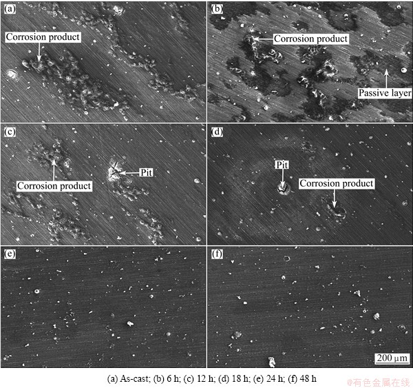 Fig. 9 Morphologies of surface after 240 h immersion in SBF for as-cast (a), 6 h (b), 12 h (c), 18 h (d), 24 h (e), and 48 h (f) solution- treated samples