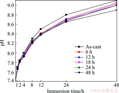 Fig. 7 pH values of SBF after 48 h immersion of as-cast and solution-treated samples