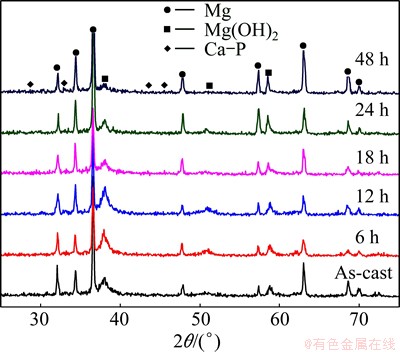 Figure 10 displays the XRD patterns of samples after the mass loss immersion test. The patterns indicate the presence of Mg as well as Mg(OH)2 and Ca-P compositions. The as-cast sample showed broad Mg(OH)2 peaks in comparison with the other samples. In contrast, the Mg(OH)2 peaks in XRD patterns of the solution-treated samples were more intense than those of the as-cast sample. Mostly, the peaks corresponding to Mg became more intense with extending solution treatment time. The intense Mg peaks in the patterns corresponding to solution-treated samples probably stem from the broad cracks in the corrosion products and peel offs. Although with the accuracy of the current study no distinct peaks corresponding to Ca-P composition were detected, careful analysis of the patterns revealed minor peaks at 2θ of 28.68°, 32.05°, 42.40° and 46.78°, indicating the presence of Ca-P compositions. Accumulation of Ca-P compositions could be retarded or even hindered by the uniform accumulation of Mg(OH)2 at the initial stage of the degradation process. Uniform Mg(OH)2 accumulation, although susceptible to Cl- attacks could avoid the localized and aggressive pH rise required for Ca-P composition precipitation.