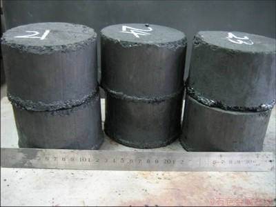 It is better to remain for a few minutes before demoulding in order to cool down the temperature of green anodes. If the demoulding temperature is too high, the green anodes break easily and the crushing strength of the prebaked anodes is low. If the demoulding temperature is too low, the green anode will glue on the mould and is difficult to demould. A green anode which has smooth surface and compact interior structure with outside diameter of 110 mm, height of 70-100 mm and mass of 1.2-1.5 kg can be produced under proper conditions (Fig. 2). The density testing showed that the bulk density of green anodes are all over 1.70 g/cm3.