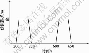 本文取陀螺漂移速度为0.01(°)/h,加速度计漂移为10-5 g,正常时GPS的位置误差为5 m,速度误差为0.1 m/s。设定一条时间跨度1 000 s的匀速飞行过程用于算法仿真,其中在200~250 s和600~650 s的时间段内对GPS可见星中的一颗关键星加入50 m的伪距误差。限于星座模拟器给出的卫星伪距误差模型,实际施加的误差由前后两端斜坡和中间一段常值模型共3段组成,如图1所示。