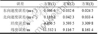 用上述3种方案进行滤波,速度和位置的滤波结果与参考真值的差值分别如图2~5所示,均方根误差比较见表1。