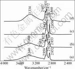 Fig.5 FT-IR spectra of orange (a), blue emitting CdS nanocrystals (b), CTAB (c) and hexanol (d), showing surfactant exchange mechanism
