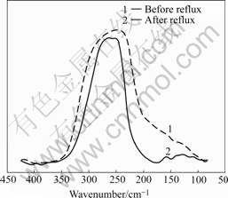 Fig.5 that the CTAB and hexanol coexist on both CdS nanocrystal surfaces before and after the reflux treatment, as the characteristic stretch vibration peaks of both CTAB and hexanol are observed in all samples. However, the wavelength and shape of IR peaks are obviously different before and after the reflux treatment. Before the reflux treatment, the IR peaks of CdS nanocrystals are mostly the same as those of CTAB in the middle IR wavelength region. The IR peaks at 2 852 and 2 923 cm-1 are indexed to the symmetry and asymmetry stretch vibration of CH2 of CTAB molecule. After the reflux treatment, the wavelength and peaks of IR peaks of CdS nanocrystals are fitted well with those of hexanol molecules. The IR peaks at 2 853, 2 869, 2 923 and 2 955 cm-1 can be indexed to the symmetry and asymmetry stretch vibration of CH2 and CH3 of hexanol molecule. The changes of IR peaks of CdS nanocrystals before and after reflux treatment suggest the surface capping agent partial replacement of CTAB by hexanol, which results in the effective surface modification and better crystallization. Moreover, the far IR spectra of CdS nanocrystals before and after reflux treatment also prove this mechanism, as shown in Fig.6. After reflux treatment, the stretch vibration of Cd-S bond of CdS nanocrystals moves to longer wavelength, implying the weakening of Cd-S interaction. This is due to the fact that hexanol has stronger interaction with Cd2+ in comparison with CTAB, and after the reflux treatment, the hexanol molecules partially replace the CTAB molecules on CdS nanocrystal surfaces, resulting in strong interaction of surface capping agent with Cd2+, which in turn weaken the Cd-S interaction. This evidence further confirms the surface capping agent replacement modification mechanism. In addition, during the reflux treatment, a small amount of CTAB separating out on the vessel wall also indirectly proves this mechanism. The surface capping agent replacement modification dominates the surface state situation, thus finally results in the luminescence discrepancy.
