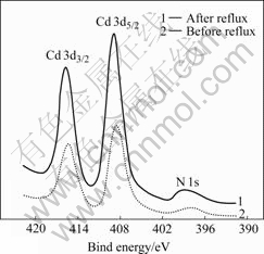 Fig.7 shows the difference of surface situation before and after reflux treatment. The accumulation of peak area indicates the molar ratio of Cd to S on nanocrystals surface is around 1?1. The binding energy of Cd 3d3/2 and Cd 3d5/2 shifts a little to higher energy, which is normally attributed to the oxidation of CdS nanocrystals or nanocrystals surface state changes. In our experiment, the reflux treatment was conducted under the nitrogen protection and there are surface capping agents on nanocrystals surfaces, so the binding energy may not be due to the oxidation, but because of the surface state changes of the nanocrystals, which was caused by enhanced modification come from hexanol partially replacing CTAB [20].