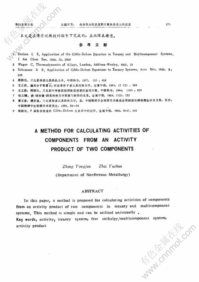 摘 要:本文提出了一种在三元系和多元系中,由两组元的活度积计算体系组元的活度及体系总超额自由焓的方法,该法简明,具有普遍适用性。