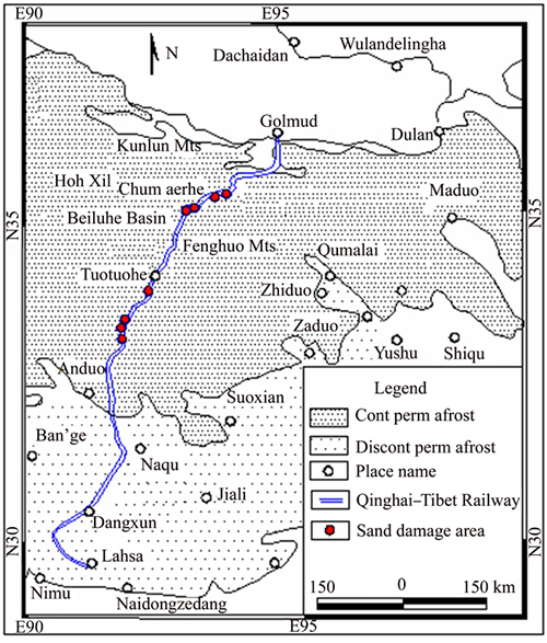 Fig. 1 Qinghai-Tibet Railway route and some sand damage locations