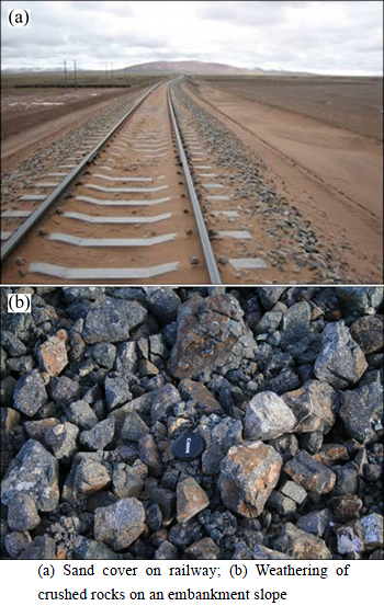 Recently, some researchers reported that the wind- blown, shifting sand buried the railway at some sites along the QTR [22, 23]. The windblown sand particles mostly affect the external portions of the crushed rock layer. As shown in Fig. 2, the CRL in some railway embankments has gradually been filled and clogged by the sands, which could cause reduction in porosity of the CRL and weaken its cooling effect, and also weathering of the crushed rocks might influence the CRL in the same way. So, the long-term adaptability and cooling effect of the CRE has become a concern for the QTR under adverse impacts of wind-blown sand clogging and rock weathering in permafrost areas.