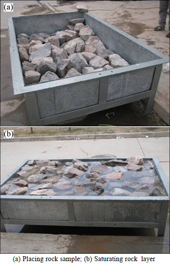 Porosity is an important parameter for calculating the permeability of porous media using the semiempirical equation [26]. So far, few studies have focused on measuring the porosity of poorly-graded media with large particle diameters (larger than 10 cm) such as crushed rock. HE et al [24] conducted some laboratory experiments to measure the porosity of poorly-graded crushed rock. In order to accumulate and enrich the experimental data of porosity of CRL and facilitate the following numerical simulations, the porosity of four other crushed rock samples was herein determined by the water saturation method. The average particle diameters of the samples were equal to 20.5, 17.5, 12 and 10 cm, respectively. The measured crushed rocks were collected and hauled to the laboratory from the field along the QTR. The testing procedure was described as follows. Firstly, the equivalent rock diameter was measured. The equivalent rock diameter is really the volume equivalent spherical diameter of an irregularly-shaped rock, which can be obtained by equating the volume of an irregularly-shaped rock with that of the regularly-shaped sphere with a diameter. For the rocks with a certain equivalent diameter, 10 of them were typically selected to be immersed in a fully water-filled container. The volume of the spilled water is the volume of a rock, by which the equivalent rock diameter was determined [27]. Secondly, porosity of crushed rock layer was measured. Considering the practical construction of the CRE in field, the crushed rocks with an equivalent diameter were arbitrarily placed in a large steel box (length'width'.0 m'1.2 m'0.4 m) (Fig. 3(a)). Determine the total volume Vt of porous media through calculating the inner volume of steel box; Secondly, pump water into the steel box and saturate the CRL (Fig. 3(b)). Determine the pumped water volume Vw; Finally, drain the water and remove the crushed rock out of steel box. Porosity n can be obtained as follows:
