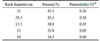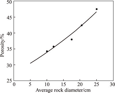 In this work, authors used the water saturation method to measure porosity of crushed rock (highly porous and permeable media). The measured diameter range of rock varied from 10 cm to 20.5 cm. HE et al [24] measured porosities of crushed rock with three diameters of 10, 15 and 25 cm. Based on these measured porosity data, an empirical equation in exponential form was built which can be used to predict other porosity of highly porous media with a diameter ranging from 10 cm to 25 cm. However, the predicted porosity of crushed rock outside this diameter range needs further calibration experimentally because measuring of porosity was affected by many factors such as the arranging manner of crushed rocks, dimension of testing box, shape and type of crushed rock and testing method. In the cases of spheres of equal size, the porosity is independent of the diameter of the spheres. However, the crushed rock layer, as a porous medium, is not a uniform medium (non- uniform spheres) because of its irregularity. Except for the particle diameter, the factors affecting its porosity of porous medium also include the packing of particles, their shape and size distribution [26]. In the practical experiments testing the porosities of the crushed rock layers with different average particle diameters, it is impossible to keep the same packing and the same shape of crushed rocks every time. So, the actual porosities are variable with average particle diameter. An important finding is observed in our and other experiments including the experimental results from HE et al [24] that larger particle diameter tends to lead to the larger porosity when arbitrarily packing the crushed rocks. The possible reason is that the crushed rocks with larger diameter are easy to create a larger void space when they are placed arbitrarily, which leads to a larger porosity. This means porosity of crushed rock layer has close relationship with diameter, due to the arbitrary placement. The finding is significant for the actual engineering construction such as selecting the larger diameter and well-sorted rocks for larger porosity and better cooling effect in cold engineering.