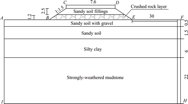 The CRE has 1: 1.5 side slopes, a width of 7.6 m at the crest of the driving surface and a height of 3.7 m including a 1.2-m-thick crushed rock layer at its bottom. For the traditional embankment model (without the CRL within it), there is no CRL within it. The numerical model has a 30-m-wide horizontal extension from right and left slope toes and this aims to eliminate the boundary effect. In vertical direction, the model also hasa 30-m-deep extension including 0.5-m-thick sandy soil layer with gravels, 1.5-m-thick sandy soil layer, 6-m- thick silty clay layer belonging to the ice-rich permafrost and 22-m-thick strongly-weathered mudstone.