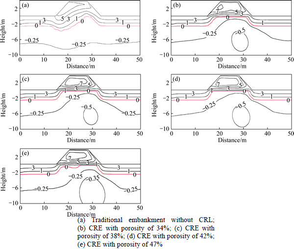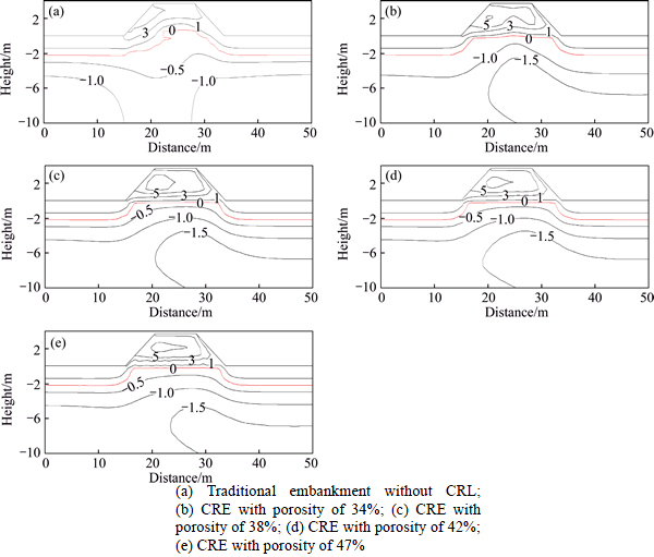 Figure 7(e) shows the temperature profile of CRE with a porosity of 47%. Note that the thermal regime remains slightly asymmetric. Thaw depths under left and right shoulder of embankment are 0.75 cm and 0.28 cm respectively, which are larger than ones in Figs. 7(b)-(d). Additionally, deep permafrost temperature becomes warmer, and reaches about -0.35 °C compared with the permafrost temperature of -0.5 °C in Figs. 7(b)-(d). This proves that there is an optimized rang of porosity of CRL for its cooling effect.