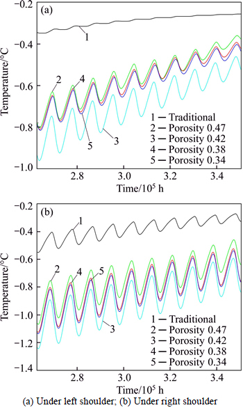 Figures 7(b)-(d) demonstrate temperature profiles of CRE models with porosities of 34%, 38%, and 42%, respectively. Three temperature profiles remain symmetric. All of thaw depths under the left and right shoulders of CREs with these three porosities are basically equal, about 0.28 m. Deep permafrost temperature beneath these three embankments is about -0.5 °C, which is warmer by 1 °C than that in the fifth year. The ground temperatures of the silty clay layer in these figures are between 0 °C and -0.5 °C which are vulnerable to thaw. However, this temperature of underlying permafrost is a little bit cooler than that beneath the traditional embankment in the 50th year. It suggests that the CRL play a cooling role in the underlying permafrost. Permafrost at above -0.5 °C is most vulnerable.