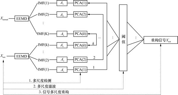 基于EEMD的多尺度主元分析降噪方法是将主元分析(PCA)故障检测能力与EEMD自适应分解信号的能力相结合。该方法主要是依据MISRA等[12-14]小波多尺度分解算法改进而来,主要不同点是本文采用了EEMD对原始信号进行自适应多尺度分解代替了小波分解。由于小波分解并非是一种自适应分解算法,在处理非线性信号时,完全依赖小波基性能。然而,EEMD是一种完全根据信号本身特性进行自适应分解的数据驱动方法。其降噪过程如图1所示。