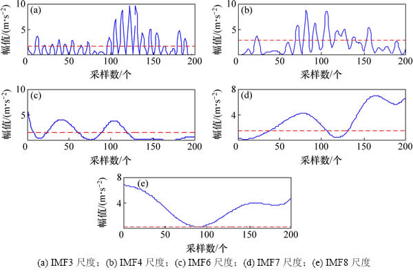 含噪故障冲击信号经过EEMD分解得到10个IMF分量,然后对每个IMF分量进行主元统计分析,EEMD-MSPCA多尺度监测结果如图3所示,其中,虚线代表各IMF分量的SPElim阈值。由图3可知:IMF3,IMF4,IMF6,IMF7和IMF8经过PCA检测分析后,大部分幅值超过了其正常工况下的SPE(lim)阈值,可以判断在以上5个IMF分量中含有故障信息。对这5个分量进行重构得到降噪后的故障信号如图4所示。图5所示为将降噪后信号与原始信号对比结果,可知原来淹没在噪声中的冲击成分,经过EEMD-MSPCA降噪后滤除了大部分噪声成分,使得故障冲击特征得到体现。