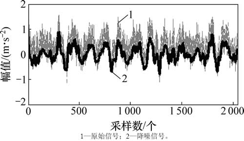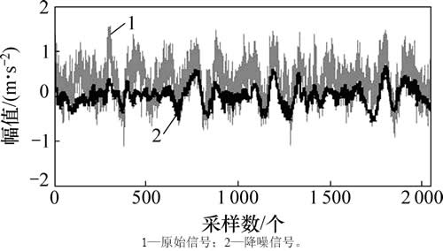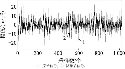应用EEMD对信号进行降噪时,关键问题是IMF分量的选取方法,若IMF分量选取不当,则会导致降噪效果不佳或将有用的IMF分量去除造成有用信息丢失。基于EEMD的相关系数降噪原理主要是根据白噪声的2个特性:1) 白噪声与任何信号不相关,因此,白噪声与原信号的互相关系数为0;2) 白噪声的自相关在零点取极值,其余为0。由于 EEMD理论上是近似正交分解,而白噪声经过近似正交分解也是趋于白噪声。所以,可以根据EEMD分解后各尺度的IMF分量与原始信号的互相关系数和各IMF分量的自相关系数,判断每1层IMF分量是信号还是噪声,去除噪声,保留信号,然后重构得到降噪后的信号。具体降噪方法见文献[8],其降噪效果如图7所示。