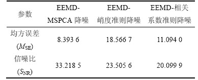 对比分析图4、图6和图7可知:图4中基于EEMD-MSPCA降噪效果最好,降噪后时域波形冲击成分较其他2种降噪方法明显,而且图4与图6、图7相比白噪声得到了很大程度降低。对于降噪效果,除了从降噪后时域波形上进行初步分析外,最重要的是依据降噪信号的均方误差(MSE)和信噪比(SNR)这2个降噪指标衡量降噪效果,其定义如下: