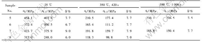 3) 含2.2%TiB2颗粒、 粒度小于74μm的粉末冶金合金挤压试样室温强度达454.1MPa, 屈服强度达407.8MPa, 延伸率保持在7.7%; 350℃高温强度稳定在210MPa以上, 延伸率稳定在7.7%以上。