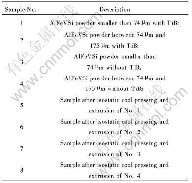 筛分得到粒度小于74μm以及74~175μm含TiB2增强相粉末和基体合金粉末, 试样编号列于表1(下同)。 1~4号粉末试样经真空除气后, 橡胶包套, 以油作为压力介质进行冷等静压, 压力为2800kN, 保压时间为60s。 去除橡皮套线切割得到d36mm×80mm试样供热挤压。 正向热挤压时在挤压筒内均匀涂敷润滑剂以减少锭坯和挤压筒内壁之间的摩擦力。 挤压系数为16∶1, 模具加热温度为400℃, 保温1h。 锭坯在400℃保温1h后快速挤压。 1~4号粉末试样经等静压并热挤压后得到的试样编号分别为: 5, 6, 7, 8。