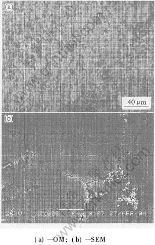 TiB2陶瓷具有极高的熔点、 硬度和弹性模量, 同时又具有良好的导电性。 近年来, 以TiB2陶瓷为增强相的金属基复合材料得到广泛的研究[8, 9]。 由于TiB2材料的共价结合特性, 很难使其致密化, 常用热压烧结或添加助烧剂烧结, 因此TiB2陶瓷的价格极其昂贵。 在选择TiB2颗粒作增强相时, 并不是直接在熔体中引入该相, 而是通过引入Al-Ti-B中间合金或者盐类反应(K2TiF6+KBF4)[10]来原位生成微米级TiB2颗粒。 图1所示为Al-Ti-B中间合金的显微组织照片。 据文献[11]报道, 在Al-Ti-B合金中随Ti和B质量比的不同, 其显微组织将出现Al3Ti和TiB2颗粒团簇, TiAl3呈长条状。 由图1分析可知, 本实验所采用的Al-Ti-B中间组织细小, 局部区域略有TiB2颗粒的团簇, 而没有大量Al3Ti等长条相的出现。 因此存在于该组织形态下的TiB2颗粒便能更好地添加到FVS0812基体中。