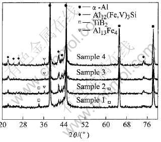 Al-Fe-V-Si系耐热铝合金具有良好的室温和高温强度、 塑性、 热稳定性、 断裂韧性以及耐腐蚀性能[1]。 其最初的开发是20世纪70年代中期, 美国海军为了寻找能取代350℃ 服役的钛合金的新型铝合金材料而进行研究, 并在20世纪90年代初相继注册了3个牌号新型合金, 即FVS0812, FVS1212, FSVS0611。 该系列合金的理想组织是以Al为基体, 弥散分布大体积分数(可达40%)的耐热强化相Al12(Fe, V)3Si, 该强化相细小均匀分布, 热力学性能稳定, 合金元素V的加入使立方结构的硅化物在高温下粗化率极低。 这样, 合金组织具有良好的热稳定性, 并且可以充分发挥弥散强化、 细晶强化和固溶强化的强化效应。 为了进一步提高 Al-Fe-V-Si系耐热铝合金的力学性能, 人们开展了在该合金中添加第二相颗粒和纤维的研究。 主要有在该合金中添加SiC颗粒[2]、 SiC晶须[3]、 Si3N[4]4、 Al18B4O[4]3以及原位生成TiC[5-7]等。 本文作者主要研究在Al-Fe-V-Si耐热铝合金体系中通过引入第二相增强的TiB2颗粒, 以期对合金显微组织和相组成有改善作用, 从而提高合金的力学性能。