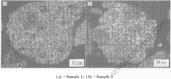 图4所示为1、 3号耐热铝合金粉末试样的金相显微组织。 可见, 粉末基本呈类球形, 没有大量方块相或针状相出现, 说明雾化冷却速度较高。 1号粉末试样组织明显比3号粉末试样组织要更细小, 说明TiB2颗粒的存在对优化耐热铝合金的组织有较显著的作用。