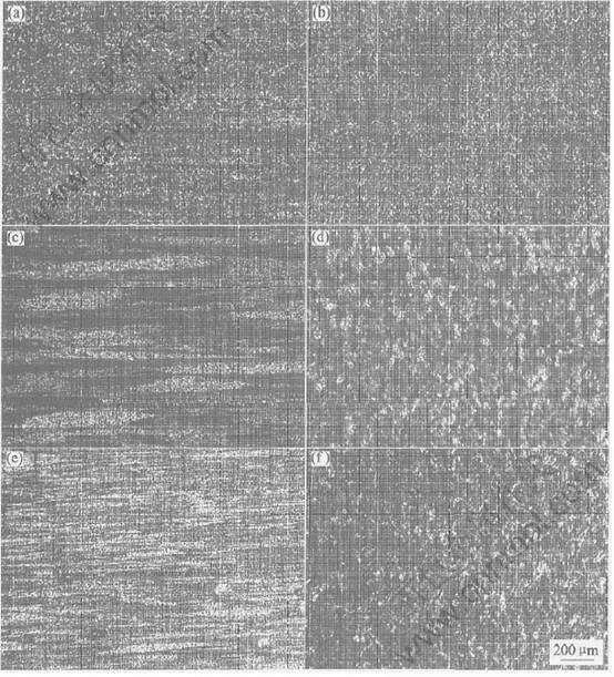 Fig.5 Microstructures of extrusion samples along extruding direction((a), (c) and (e)) and cross section ((b), (d) and (f)) (a), (b)—Sample 5; (c), (d)—Sample 6; (e), (f)—Sample 7