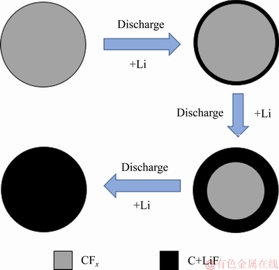 此外,Li/CFx电池的放电过程,还可以用一个由CFx内核和放电产物层(LiF+C)所构成的“核-壳”模型来加以粗略地描述[19],如图1所示。随着放电过程的连续进行,CFx内核的半径也在不断地减小,而由LiF晶粒和无定形碳所组成的放电产物层的厚度,则会不断地增大[20]。
