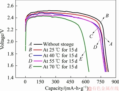 为了考察Li/CFx电池的高温自放电行为,本文分别采用固定存储时间和固定存储温度的方法,分类测试了Li/CFx电池在不同储存条件下的放电性能。图2所示为在固定储存时间(15天)的条件下,Li/CFx电池经过不同温度储存后的放电曲线图。由图2可以看出,Li/CFx电池储存前的放电比能量为825.2 mA·h/g(曲线A)。当Li/CFx电池分别在25、40、55和70 ℃的温度条件下储存15天后,Li/CFx电池的放电比容量发生了明显的衰减。不同温度下Li/CFx电池的剩余比容量分别为811.2 mA·h/g(曲线B)、799.2 mA·h/g(曲线C)、792.3 mA·h/g(曲线D)和630.8 mA·h/g(曲线E),对应的电池比容量衰减率分别为1.70%、3.15%、3.99%和23.56%。Li/CFx电池的放电平台也从储存前的2.52 V逐步降低到2.42 V。此外,储存后的Li/CFx电池放电的电压滞后现象,也会随着储存温度的升高而变得越来越明显。尤其是在70 ℃下,电池的初始放电电压平台已经下降到1.84 V。