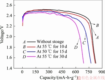 Fig. 3 Discharge curves of Li/CFx batteries at 86 mA/g after storage at 55 ℃ for different days