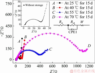 Fig. 4 Impedance spectra of Li/CFx batteries after storage at different temperatures for 15 days