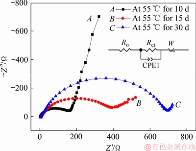 图5 Li/CFx电池在55 ℃下储存不同时间后的阻抗图谱