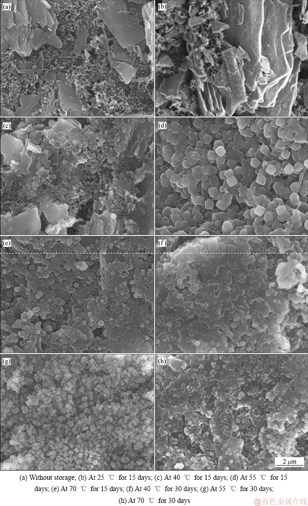 为了进一步分析Li/CFx电池经过高温储存后发生容量衰减的原因,把储存一定时间后的Li/CFx电池(未放电)进行拆解,观察CFx阴极材料表面的形貌变化,结果如图6所示。在未储存的Li/CFx电池的CFx阴极表面上(见图6(a)),片状的CFx晶体均匀地分布在导电剂和粘结剂的混合物中[26]。图6(b)~(e)显示了在不同储存温度下储存15天后的CFx阴极表面形貌。从图6(b)和(c)中可以发现,CFx阴极表面形貌基本上与图6(a)相似,表明Li/CFx电池的自放电程度还不太严重。而图6(d)和(e)则显示,CFx阴极表面上布满了细小的立方型LiF晶粒,表明随着储存时间的延长,Li/CFx电池的自放电行为会越来越严重。相对于经过外电路电流放电后的Li/CFx电池,CFx阴极表面上自放电形成的LiF晶粒的大小比较均匀, 这是由于Li/CFx电池自放电的电流密度较小且分布均匀的缘故[27]。图6(f)~(h)是在不同储存温度下储存15天后的Li/CFx电池的CFx阴极表面形貌。从这三张图片中可以看出,CFx阴极表面上同样充满了致密的LiF晶粒,表明经过高温的储存后,完整的放电产物层(LiF+C)已经在CFx阴极表面上形成。