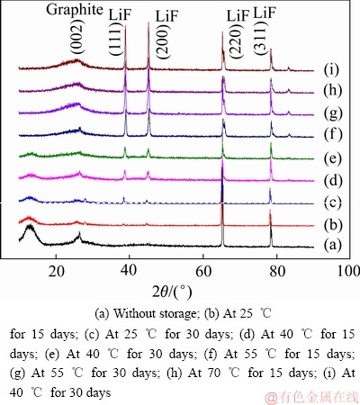 图7 CFx阴极在不同温度下储存不同时间后的XRD谱
