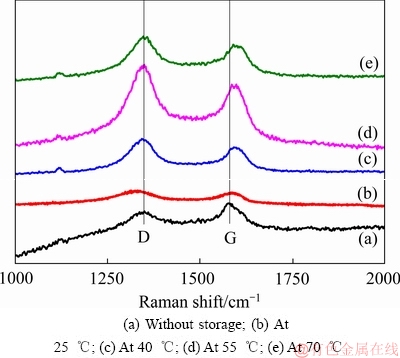 图8 CFx阴极在不同温度下储存15天后的Raman谱