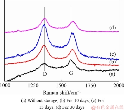 图9 CFx阴极在55 ℃下储存不同时间后的Raman谱