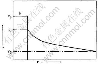 Fig.4 Solute concentration profile near a δ phase particle during diffusion-controlled dissolution